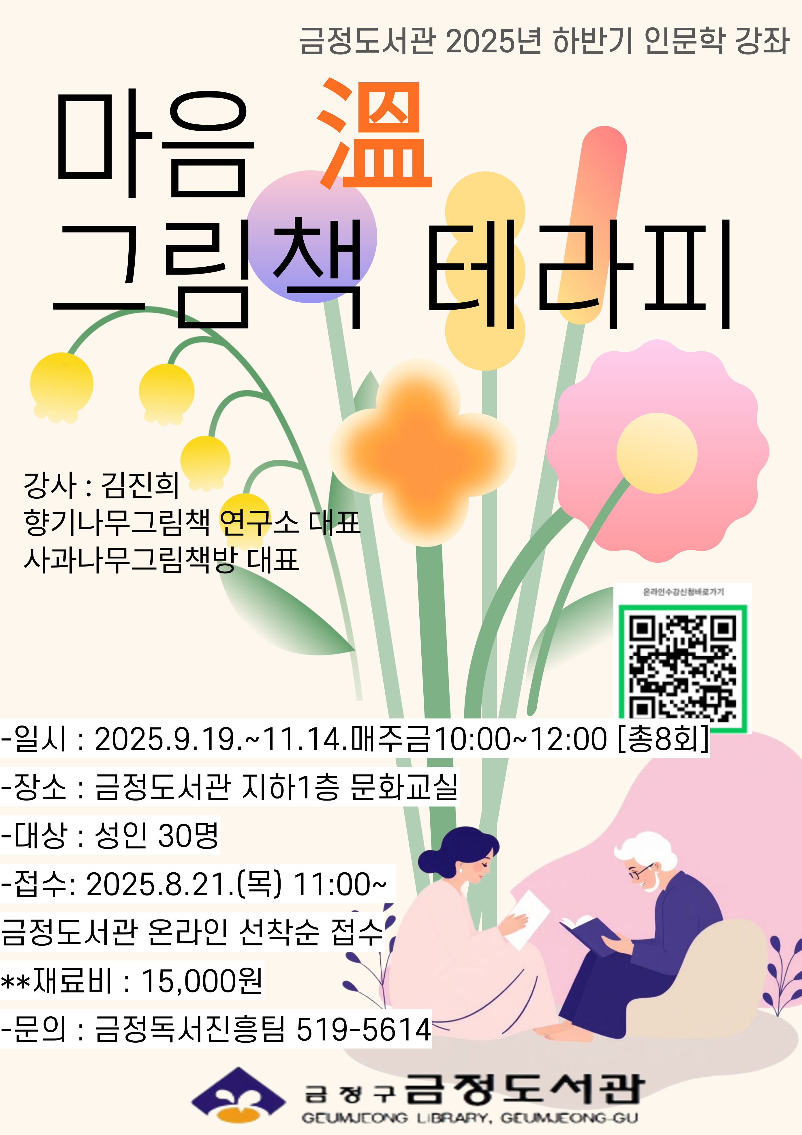| - 일시 : 9/13~10/25 매주(금) 10:00~12:00 - 장소 : 2층 배움터 - 대상 : 성인 20명 - 내용 : 동화창작의 이론을 배우고 단계에 맞는 글쓰기와 피드백의 과정을 통해 각자 통화 한편 완성 - 접수 : 2024.8.22(목) 10:00 ~ 선착순 마감 - 방법 : 신청자 전원 각각 수강신청 해야 합니다 (가족 중 1명만 신청하여 3명 참가 등 불가) 대리신청, 중복신청은 사전 고지없이 취소 처리 될 수 있습니다. -강연내용 확인 : ( 알림마당 ) 의 내용 | 이용자마당 | 부산광역시 금정도서관 (geumjeong.go.kr) ※ 행사 참여 모습은 도서관 홍보(비영리 목적)를 위해 촬영 및 활용 될 수 있습니다. |