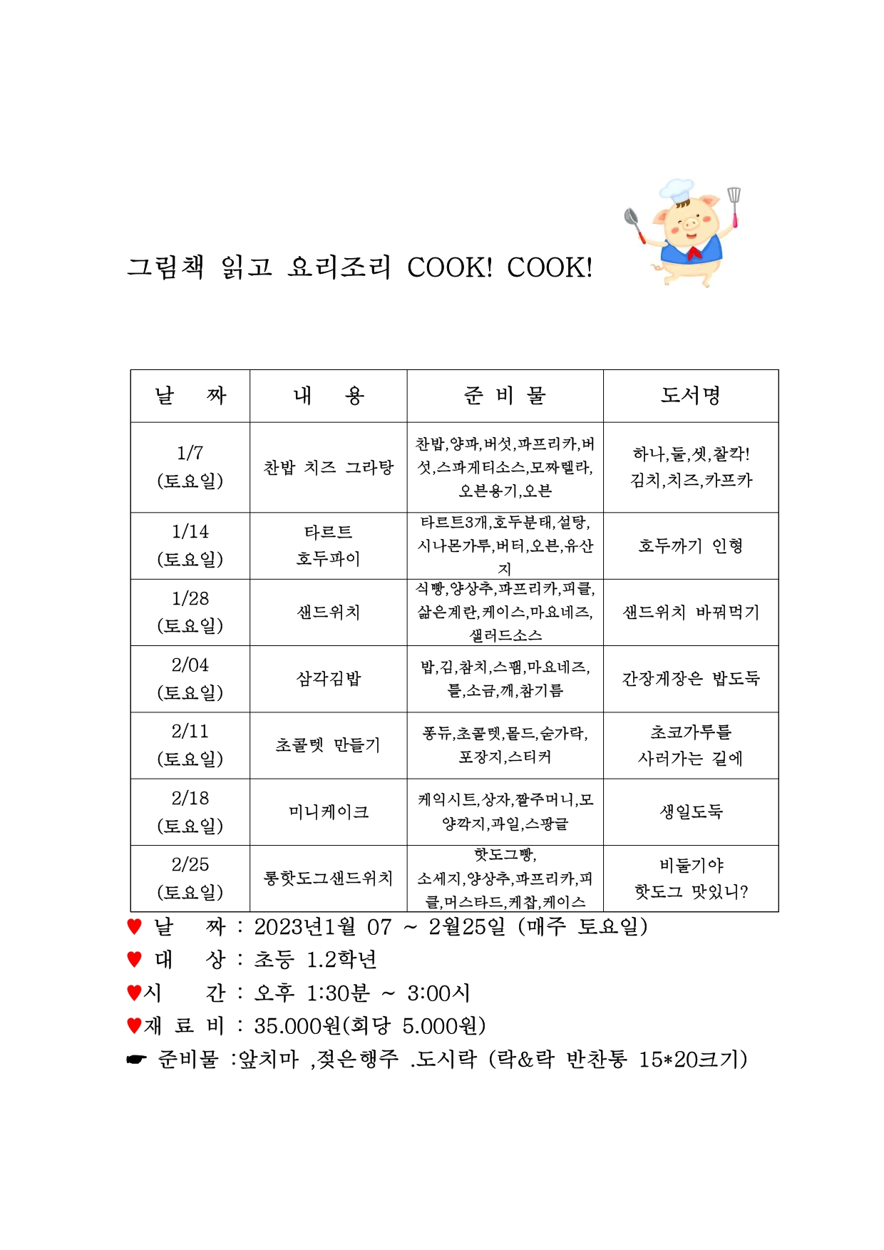 | [겨울방학특강]그림책 읽고 요리조리 COOK! COOK!(초등1~2학년※22년도 기준. 15,14년생) | |