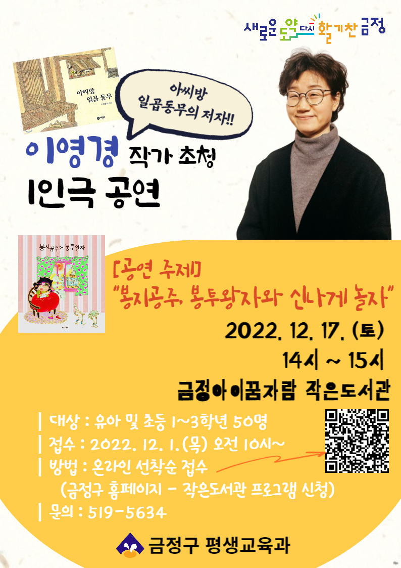 | ▢ 이영경 작가 1인극 공연 「봉지공주, 봉투왕자와 신나게 놀자」 운영일시 : 2022. 12. 17.(토) 14:00~15:00 운영대상 : 유아 및 초등 50명 운영장소 : 금정아이꿈자람 작은도서관 초청작가 : 이영경 (그림책작가) 공연주제 : 봉지공주, 봉투왕자와 신나게 놀자 접수일시 : 2022. 12. 1.(목) 10:00~ 접수방법 : 금정구청 작은도서관 홈페이지 내 온라인 수강신청 |