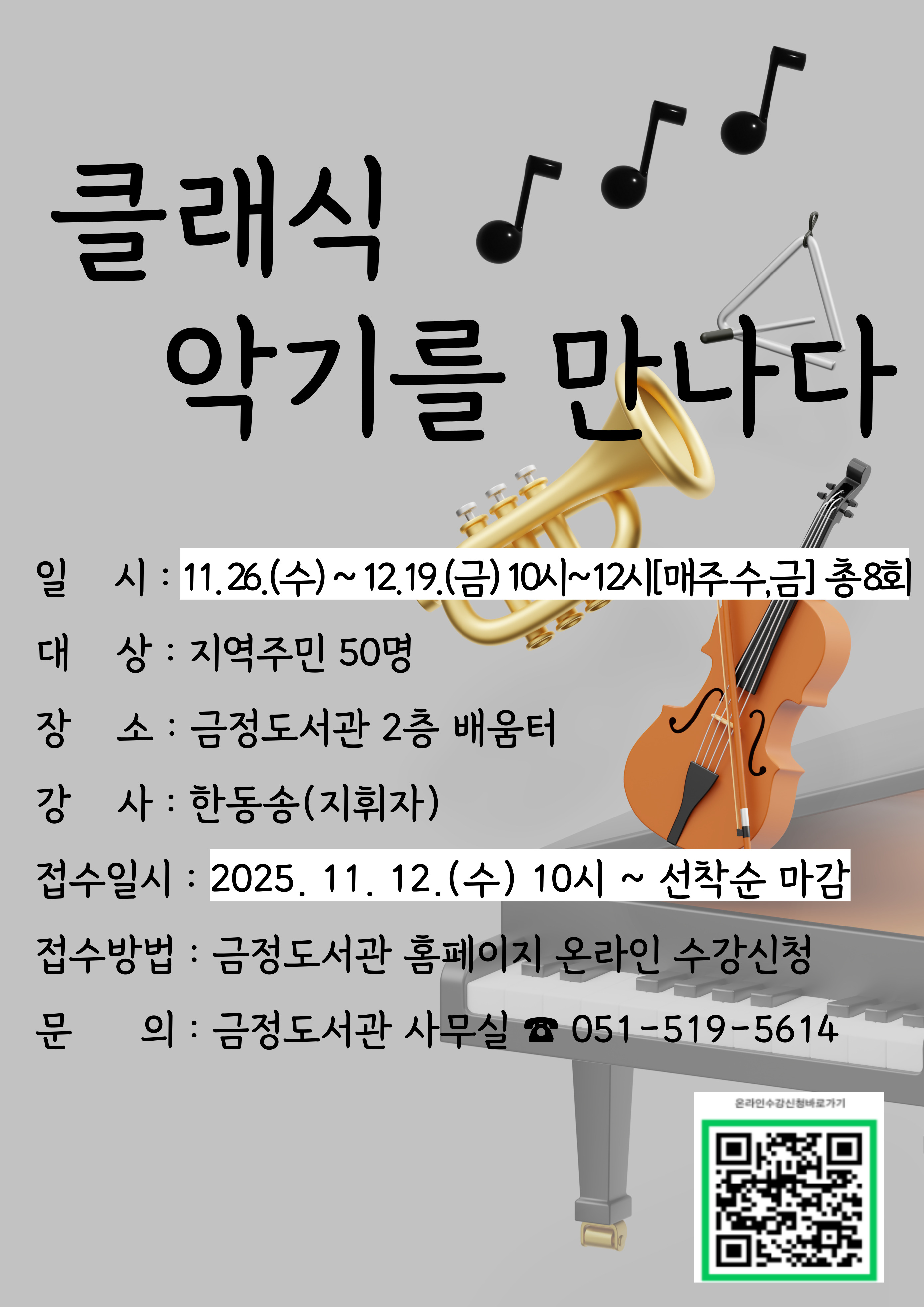 ![]() 금정도서관 2025년 문화학교 [클래식, 악기를 만나다]
