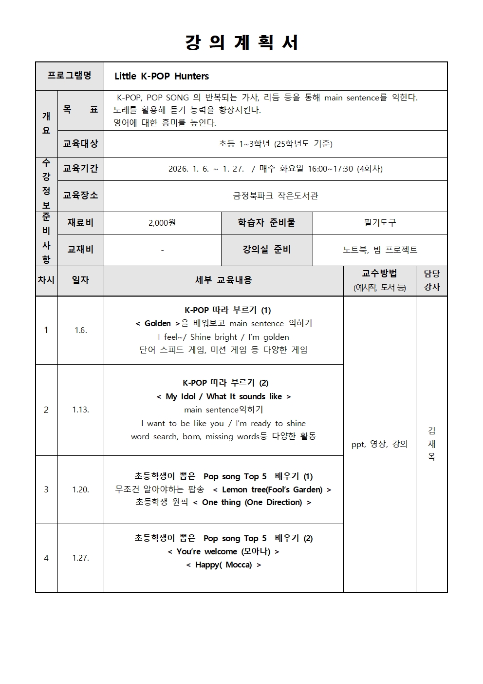 | [방학특강/금정북파크] Little K-POP Hunters | |