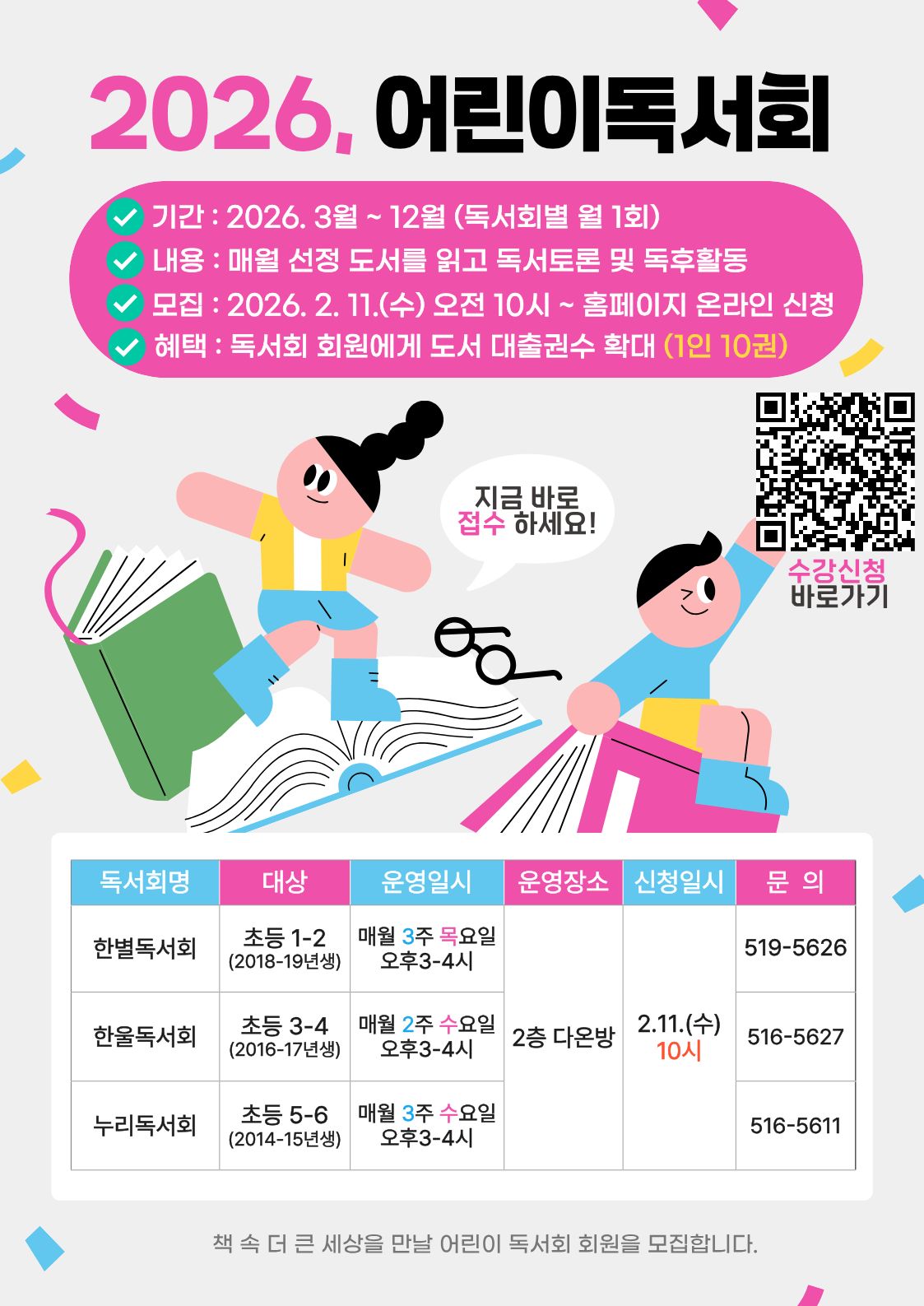 | <금정도서관 2026년 한울독서회 회원 모집> ㅁ기간 : 2026년 3월~12월(독서회 별 월 1회 - 매월 두번째 수요일 진행) ㅁ대상 : 초등 3~4학년 10명 ※ 2016-2017년생 대상(2026년도 기준) ㅁ장소 : 금정도서관 2층 다온방(※ 상황에 따라 장소 변경가능) ㅁ내용 : 매월 도서를 선정하여 읽고 독서토론 및 독후활동 진행 ㅁ혜택 : 독서회 회원 도서 대출가능 권수 1인 5권 ☞ 10권으로 확대(26년도) ㅁ접수 : 2026. 2. 11.(수) 10:00 ~ 선착순 마감 ㅁ방법 : 금정도서관 홈페이지->문화마당->온라인 수강신청 ※ 3회 이상 불참시 회원에서 제명됩니다 |