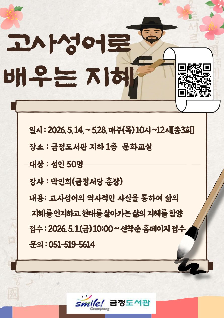 | 가정의 달을 맞아 세대간 공감과 소통을 증진하고 일상 속 성찰의 기회를 제공하는 인문학 특강 고사성어로 배우는 지혜 ●운영일시 : 2026. 5. 14. ~ 5. 28. 매주 목 10:00 ~ 12:00 [총 3회] ●운영장소 : 금정도서관 지하 1층 문화교실 ●운영대상 : 성인 50명 ●운영내용 : 고사성어의 역사적인 사실을 통하여 옛 것을 되살려 삶의 지혜를 인지하고 현대를 삻아가는 삶의 지혜를 함양해 본다 ●강 사 : 박인희(금정서당 훈장) ●접수기간: 2026. 5. 1.(금) 10:00 ~ 홈페이지 온라인 선착순 ●문 의 : 051-519-5614 ![]() |